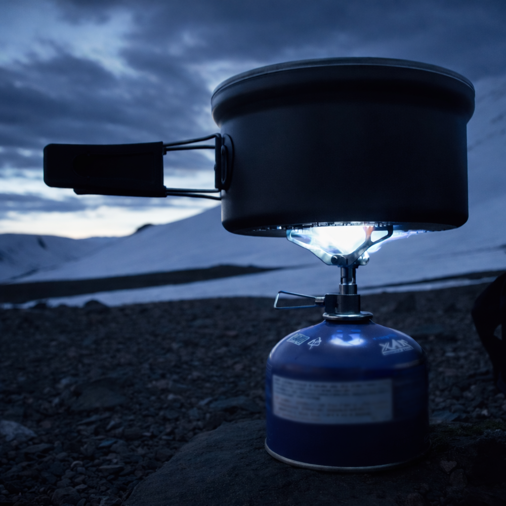 En liten gassboks kombinert med BRS 3000T og en titankjele gir et av de letteste kokeoppsettene for vann på tur. Brenneren passer best for enkel matlaging og rask oppkoking.